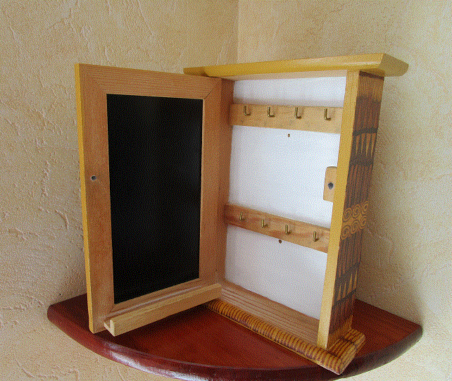 Cette boîte à clefs comprend une porte avec, sur le devant et à l'intérieur, une partie tableau où on peut écrire avec une craie. A l'intérieur 8 crochets permettent de suspendre les clefs. A la base de la porte, côté intérieur, se trouve un petit rangement pour la craie (qui est livrée avec la boîte). Le fond est recouvert de plusieurs couches de peinture acrylique de couleur ocre.